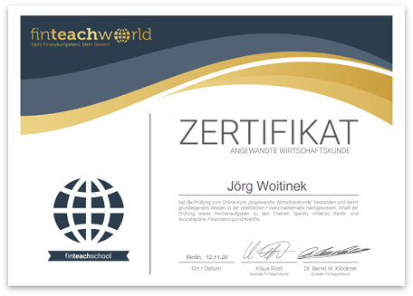 Investiere 20 Euro für deine finanzielle Kompetenz. Buche den Kurs „finteachschool – angewandte Wirtschaftskunde“ und erhalte nach bestandener Prüfung das offizielle Zertifikat von finteachworld!